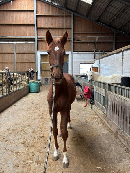 Hannoveraner Stutfohlen Violett Geboren April 2025 Abstammung: Brentano x Matcho AA x van Vermeer Violett ist eine bezaubernde Hannoveraner Stute, die mit ihrer Ausstrahlung sofort die Herzen erobert. Sie überzeugt nicht nur durch ihr harmonisches, ansprechendes Exterieur, sondern ganz besonders durch ihren offenen, menschenbezogenen Charakter. Violett sucht die Nähe zum Menschen, ist sehr verschmust und genießt jede liebevolle Aufmerksamkeit. Sie kennt Kinder und lässt sich von ihnen ruhig und geduldig putzen – ein echtes Herzensfohlen. Auch der lebendige Hofalltag ist ihr bestens vertraut: Hunde, Traktoren, spielende Kinder und der tägliche Trubel gehören für sie ganz selbstverständlich dazu. Violett wächst im Herdenverband auf und entwickelt sich dort sozial, ausgeglichen und selbstbewusst. Mit ihrem kompakten, gut proportionierten Körperbau sowie ihren raumgreifenden, geschmeidigen Bewegungen bringt sie beste Voraussetzungen für ihre weitere Entwicklung mit. Beim Schmied zeigt sie sich bereits jetzt vorbildlich und brav. Für Violett wünsche ich mir ein liebevolles, förderndes Zuhause, in dem sie mit Geduld, Zeit und Herz weiter aufwachsen darf. Sie ist kein „Projekt“, sondern ein junges Pferd mit Seele – und soll genau so auch gesehen werden. 01704804667
