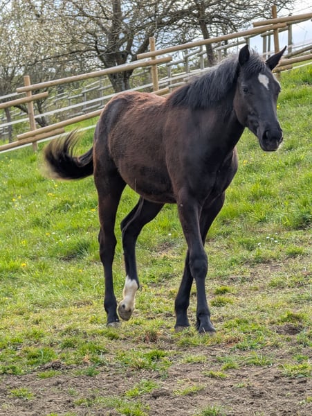 For sale is Lilly Lumpa (born July 9, 2025), a stunning Hanoverian mare distinguished by her noble type, correct conformation, and charming presence. Lilly currently presents as a foal with a modern, athletic build. If you are looking for an expressive partner for future dressage competitions and value a trusting partnership from the very beginning, this charming mare is a raw diamond with excellent sporting potential. Thanks to her size, she is the ideal choice for riders or ambitious junior riders seeking a quality young horse to bring along themselves, impressing with ease and harmony. Pedigree & Quality Lilly’s genetics are top-notch: Sire: The exceptional stallion Lord Europe, renowned for outstanding gaits and rideability. Dam: The main mare Henrike (by Heinrich Heine – Don Frederico). She boasts a dressage breeding value (TSP) of 114 and has passed on Lilly’s elegant type and correct basic gaits. Character & Developmental Status As a foal, Lilly is already well-prepared for her next life stage: Handling: She is very people-oriented, halter-trained, leads, and is easy to groom. Husbandry: She has been raised appropriately and shows herself to be very social and lively within a herd. Appearance: Dark bay with a star and snip, plus a white hind leg. Key Data at a Glance Name: Lilly Lumpa Date of Birth: July 9, 2025 Status: Foal Lilly is microchipped, registered with the Hanoverian Verband, and can move into her new home immediately.