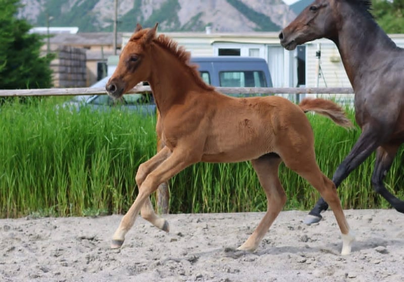 We are pleased to introduce Kali du Moulin, a young Hanoverian filly born on March 28, 2025, now available for reservation by a serious and dedicated home. Bred from prestigious bloodlines focused 100% on dressage, she already displays all the qualities to become a high-level sport mare or a refined partner for an ambitious amateur career. Sire: Kjento (KWPN) – son of Negro and Jazz, Kjento is a two-time World Champion for young horses: at age 6 with an outstanding score of 96%, and at age 7 with a 10/10 for canter and an overall score of 85%. He passes on to his offspring a spectacular movement, strength, and great suppleness. Dam's sire: Diamond Hit x Rohdiamant – Born at Heinrich Ramsbrock’s, Kali’s dam, Radieschen (Hanoverian), comes from a solid and renowned lineage known for producing elegant horses that are sound-minded and good under saddle. Kali exhibits excellent conformation and a modern frame with expressive movement. She has three excellent gaits and was recently evaluated with the following comments: 8.2 / 10 overall impression and potential, highlighting her overall talent and quality of her model, 7.8 in walk, for her good engagement and supple, expressive stride, 7.6 in canter, with a beautiful scope, rebounding, and promising shoulder freedom, 7.5 in trot, emphasizing good cadence, active hindquarters, and a lively, springy movement. She was raised in a family environment that respects the young horse, in a herd, on pasture during summer, and with unlimited hay in winter. She is handled regularly (halter, feet, care), and receives consistent farrier and osteopathic attention. Her diet is carefully managed, based on high-quality St. Hippolyt and CMV products. The breeder also offers the possibility of keeping her in a low-cost retirement paddock until she turns 3, under conditions suitable for her development. With her elegant build, mental qualities, dressage XXL bloodlines, and well-considered upbringing, Kali du Moulin is a rare filly, to be developed gradually. She will suit a rider seeking elegance, exceptional movement, and a reliable temperament to confidently pursue her future.