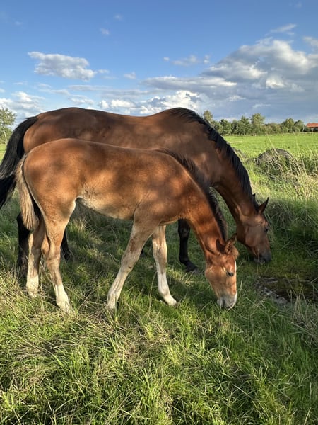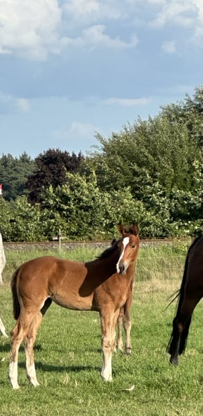 Only You M is a typy, beautifully marked, and likable filly (born on 09.05.2025). Her maternal grandfather is Chacco Blue: already a legend, he made headlines with a 3rd place finish in the Grand Prix of Aachen, showcasing the talents of Chambertin's son. Her sire is Ogano Sitte, by Darco x Avontuur x Major de la Cour: Under rider Dominique Hendrickx, Ogano Sitte achieved international success at 4-star level and won the 1.60 m Grand Prix CSI**** in Naples. His immense fighting spirit and excellent attitude set him apart. His father Darco, who won numerous Grand Prix events and was seventh in the individual standings at the 1992 Olympic Games in Barcelona, has shaped the international show jumping scene with offspring like Sapphire (Mc Lain Ward/USA), Parco (Ludo Philippaerts/BEL), and Winningmood (Luciana Diniz/POR). The suffix "Sitte" traces back to Ogano Sitte's great-grandmother Gute Sitte, a successful Hanoverian daughter of the influential stallion Grande from a pure Thoroughbred mother, who won team bronze at the 1976 Olympic Games in Montreal with Eric Wauters/BEL. The name "Sitte" is synonymous worldwide with exceptional quality in show jumping, toughness, and fighting spirit. Over 80 descendants have made it to the top sport and impress on the international stage. Successful offspring include Arac du Seigneur under Angelique Rüsen (GER), H&M Ikker under the Philippaerts brothers (BEL), Sisley de la Tour Vidal under Pénélope Leprévost (FRA), Aganix du Seigneur under Jos Lansink (BEL), Button Sitte under Richard Moloney (IRL), Viego les Hauts under Victoria Gulliksen (NOR), Gaudi under Paola Amilibia (MEX), Legend under Eduardo Álvarez Aznar (ESP), and Thelma ala Tour Vidal under Koti Sato (JAP). A pedigree that speaks for itself.