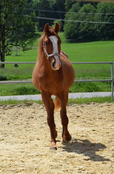 Due to unreliable buyers, this beautiful young mare is available again. Because of my retirement from breeding (due to health reasons), this tall-legged 2-year-old mare by ESCANTO PS out of BENICIO is for sale. A very sweet, affectionate, and people-oriented mare, completely clear-headed and very resilient, with excellent gaits. She is long-legged, elegant, correct, very brave, and full of charm. She is sure to become an excellent riding horse! Raised in an open stable, she is also accustomed to being stabled at night. She is regularly dewormed, vaccinated, and has been introduced to the blacksmith. The mare is likely to stay small, which might also make her interesting for pony breeding. Born April 2023, chestnut. Lineage from the SCHLIESSERIN, one of the best Hannoverian mare lines! All photos and videos are up to date.
