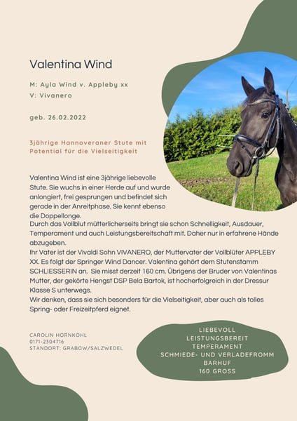 Sie ist 3jährig , Hannoveraner und wurde für die Vielseitigkeit gezogen. Ihr Vater ist der Vivaldi Sohn VIVANERO, Der Muttervater der Vollblüter APPLEBY XX. Es folgt der Springer Wind Dancer. Valentina gehört dem Stutenstamm SCHLIESSERIN an. Ihre Züchterin wünscht sich, dass ihre Zukunft in der Vielseitigkeit liegt. Sie ist angeritten an der Longe, aber noch nicht sicher unter dem Sattel. Aufgrund von Kapazitätsmangel abzugeben. Sie misst derzeit 160 cm.