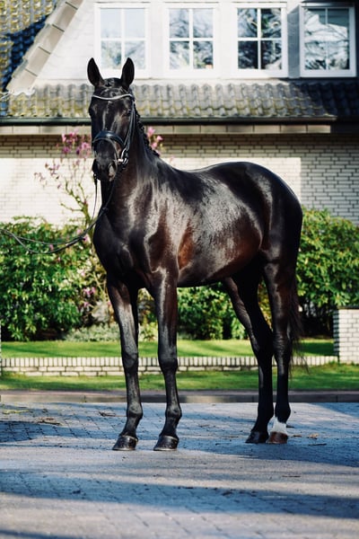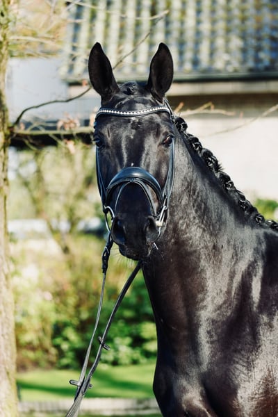 Very elegant, jet-black 3-year-old mare with a striking presence and a modern appearance. She impresses with excellent basic gaits, plenty of go, and a high level of willingness to perform. Spirited yet always honest, hardworking, and easy to handle in daily interactions. A modern, high-quality young horse with excellent potential for further training – ideal for ambitious riders seeking a talented young prospect with a strong work ethic.