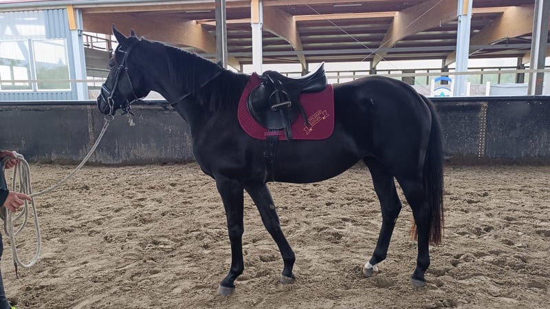 Hannoveraner Rappstute – 3 Jahre, 165 cm, wächst noch Sie ist möchte was tun und lernt schnell. Zum Verkauf steht eine vielversprechende, 3-jährige Hannoveraner Rappstute mit aktuell ca. 165cm Stockmaß (im Wachstum). Sie ist schonend angeritten, sicher in allen Gangarten beide Seiten. Sie ist unerschrocken und ihres Alters entsprechend Mega gelassen. Für den Anfänger und auch Fortgeschrittenen. Sie wird vom Boden aus gearbeitet, kennt die Longe und zeigt sich dabei aufmerksam, lernwillig und gelassen. Im täglichen Umgang ist sie sehr brav, menschenbezogen und unkompliziert. • Altersgemäß schonend gearbeitet • Geländeerfahrung am Strick, souverän und entspannt • mittlerer Rang-Ranghoch, dabei herdenverträglich und sozial Sehr gute Grundlage für den weiteren Ausbildungsweg Eine ideale Stute für alle, die sich eine zuverlässige, charakterstarke Partnerin mit solider Basis wünschen.