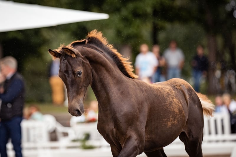 Preciosa yegua castaña oscura K.C. Can Fly por Conthargos de la yegua de salto K.C. Diana. Tamaño final esperado 170. nacida el 20.03.22. Prima de oro. K.C. Can Fly es una transferencia embrionaria, por lo que la yegua de las fotos no es la madre. La madre Diana esta colocada en salto M y actualmente en entrenamiento para salto de 150 cm. K.C. can Fly fue el campeón de los potros de salto en los campeonatos de potros de Wickrath. El veredicto del jurado: "No puede ser más bonita y mejor". Su hermana completa Carrera (yegua negra) también recibió la prima de oro en la exposición de potros de Wickrath el 9 de agosto (ambas yeguas son transferencias de embriones).
