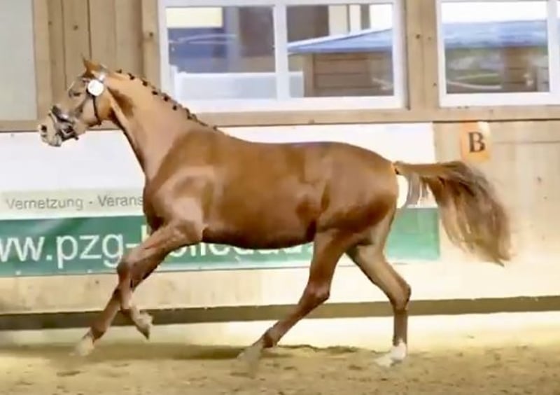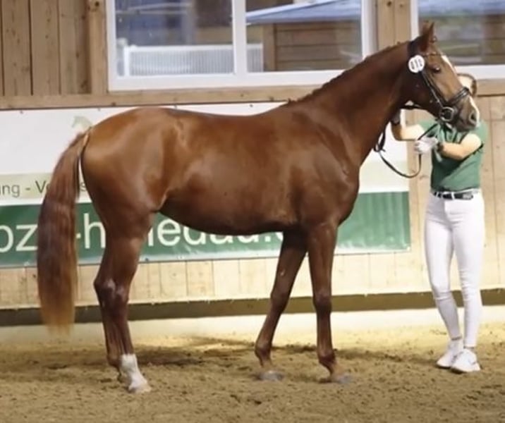 **For sale: Beautiful Hanoverian mare** For sale is a pregnant impressive Hanoverian broodmare born in 2021. This elegant chestnut mare impresses with her charming appearance and her excellent dressage disposition. **Characteristics:** - Breed:** Hanoverian - Gender:** Mare - Year of birth:** 2021 - **Color:** Chestnut - Height:** 158 cm - **Discipline:** Dressage This young mare finished the mare performance test with a final score of 8.22. Felicia has a very good character, is smart and very rideable. She shows great potential in dressage and is above average in free jumping. Felicia is ready for further training. She has a friendly nature, is willing to learn and is always motivated at work. Ideal for ambitious riders looking for a talented young horse. If you are interested and would like further information, please contact us on 0174/8855742.