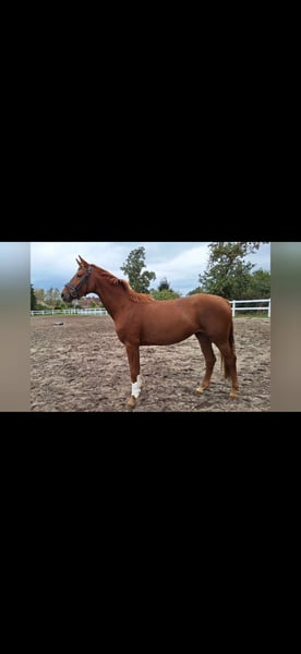 ✨ 3-year-old mare by Fidelity out of a Sir Donnerhall I / Weltmeyer dam ✨ Age: 3 years Height: approximately 16.2–16.3 hh Pedigree: Sire: Fidelity Dam: Sir Donnerhall I / Weltmeyer Description: This mare is being sold as a foal and has not yet been backed. She has been lunged but has not undergone further training steps. She is very sensitive and requires an experienced rider or trainer who can handle her with patience and gentle guidance. Basic handling training (foal and young horse education) has been introduced, but she is not malicious. Features: - Very good basic gaits - Elegant, modern type - Great potential for dressage - Already lunged Note: The buyer should have experience in handling unbroken horses and training young horses.