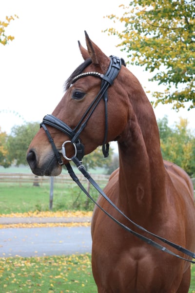 Zum Verkauf steht diese 4-jährige charmante Stute von Von und Zu aus einem sehr bewährten und erfolgreichem Stutenstamm. Die Stute überzeugt mit drei gleichmäßig guten Grundgangarten, einer tollen Rittigkeit und ihrer positiven Einstellung. Sie ist mit dem nötigen "Go" ausgestattet und immer motiviert und engagiert bei der Arbeit. Sie möchte zu jeder Zeit alles richtig machen und ihrem Reiter gefallen Im Umgang weiß sie mit ihrer angenehm zurückhaltenden und gleichzeitig aber auch neugierigen und aufgeweckten Art die Leute um den Finger zu wickeln. Sie ist dieses Jahr zweimal in Reitpferdeprüfungen gestartet und hat sich dort auch zweimal platziert (Einzelnoten bis 8,0). Außerdem kennt sie das Reiten im Gelände und hat bereits mit Reiter einen kleinen Parcours gemeistert, wurde hier aber nicht weiter gefördert. Hier reift ein ganz tolles Familien- & gleichzeitig besonderes Nachwuchspferd heran, dem bei der richtigen Förderung alle Türen offen stehen. Aufgrund ihrer Größe wäre sie ein tolles Mädchen- & Damenreitpferd. In reiner Boxenhaltung koppt sie gelegentlich, weswegen sie weit unter Wert abgegeben wird. Vorzugsweise abzugeben in Hände mit Offenstallhaltung.
