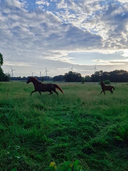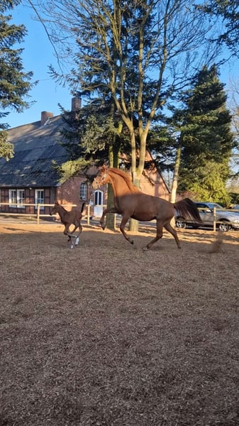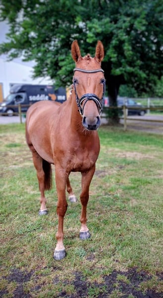 We are offering a premium Hanoverian mare from the well-known Schneiderin bloodline for sale. Her pedigree includes Tangelo v. de Zuethove x Diarados Boy x Drosselklang, combining proven jumping genes with excellent type, good free-jumping ability, and a strong character. Standing approximately 16.1 hh, she has a sporty build, is correctly conformed, and presents herself with a modern appearance. She successfully passed her mare performance test with good results. After her first foal, which has now been weaned, Tara is currently being lightly retrained and demonstrates a very rideable, motivated, and eager-to-learn temperament. Her foal from this year already impresses with an exceptionally clear mind, excellent nerves, and a pleasant demeanor. Whether as a promising young sport mare or a valuable addition to a breeding program, Tara is interesting in every respect. In daily handling, she is a true sweetheart – friendly, human-oriented, and completely uncomplicated. Tara is everybody’s darling!