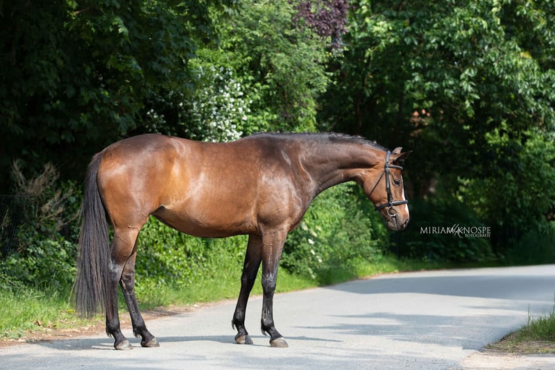Schicke 4-jährige dunkelbraune Hannoveraner Stute, z.Zt. ca. 167 cm groß, als 3-Jährige in das Hannoveraner Stutbuch eingetragen Sie verfügt über einen unerschrockenen, mutigen und aufgeweckten Charakter und ist in einem intakten Herdenverband mit mehreren Generationen aufgewachsen. Auffallend ist ihr edler, ausdrucksstarker Kopf. Sie zeigt gute Grundgangarten, einen sehr geregelten Schritt mit gut erkennbarem Übertritt und einen guten Trab aus der Hinterhand. Sie ist dressur- und vielseitig veranlagt. Sie wird seit einigen Monaten unter dem Sattel gearbeitet und zeigt sich dabei sehr willig, unkompliziert und kooperativ. Ihre Nervenstärke, Ruhe und Gelassenheit (siehe Video mit Plane) sind eine hervorragende Basis. Sie wird ein sehr guter Partner für den anspruchsvollen Freizeitbereich werden. Röntgenbilder liegen vor und sind ohne Risikobefunde. Sie wird direkt vom Züchter verkauft. Preis VS. Kontakt: 01788688799.