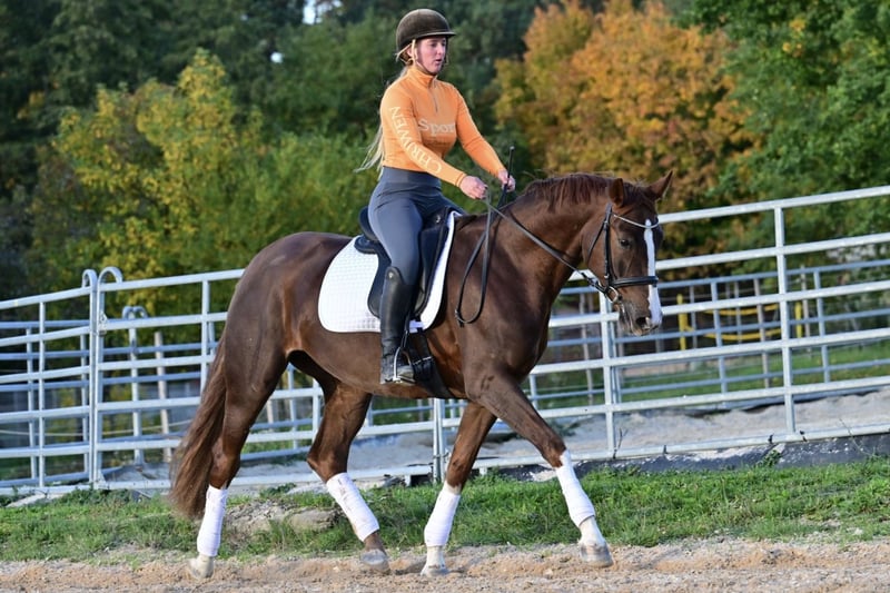 * V.: Rotspon x Donnerball - Donnerhall, Rosenkavalier, Florestan I, Rubinstein I, Weltmeyer, Focus… * 2021 geboren * Stute * zur Zeit 1,68m Stockmaß * Herdenvertraglich * Verladefromm * Schmiedefromm * von 15j. Jugendlicher geritten * im Gelände artig * unerschrocken * Würzburg * Transport gegen Aufpreis möglich * Beritt möglich * Große AKU für ca. 800,- * im Auftrag Diese Stute ist ein richtiger Hingucker. Totschick im schönen Dunkelfuchs Lack, mit einer herrlichen Aufmachung. Super artig im Umgang, lässt alles mit sich machen und ist sehr aufgeschlossen, freundlich und immer interessiert. Beim Reiten sehr angenehm zu sitzen. Gleicht einem Sofa. Sie ist sehr harmonisch zu reiten für die kurze Zeit unterm Sattel. Im großen und Ganzen ein unfassbar schönes Reitgefühl. Das Go muss sie noch ein bisschen üben. Der Schritt ist wirklich sehr gut, im Galopp zeigt sie immer wieder eine schöne Bergauf Tendenz. Es wird aber kontinuierlich besser. Sie wurde schon von einer 15 j. Jugendlicher geritten und war schon ganz brav alleine und in der Gruppe im Gelände. Es werden nur ordentliche Anfragen mit ernsthaftem Interesse beantwortet. Auf unverschämte Anfragen wird nicht eingegangen. Für das Probereiten nehmen wir 25,-, welches beim Kauf verrechnet wird. Anfänger nur mit Begleitung des erfahrenen Trainers. Preis steigt entsprechend der weiteren Ausbildung.