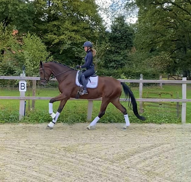 🍀Aufsteigen, los reiten, wohlfühlen 🍀 Diese 4-jährige Stute von Dancier Gold x Benicio ist jetzt schon trotz ihres jungen Alter ein absolutes Verlasspferd. Aktuell 1,69m groß, allerdings noch voll im Wachstum. Ganz am Anfang ihrer Ausbildung begeistert sie mit drei guten Grundgangarten, wobei der Schritt besonders hervorzuheben ist. Zuhause springt sie spielerisch fliegende Galoppwechsel und bei ihrem ersten Turnierstart glänzte sie mit absoluter Gelassenheit. Eine perfekte Stute für den Umsteiger oder als Familienpferd. Schmiede und verladefromm. Kennt Herdenhaltung und Schrittrunden bzw. kleine Ausritte. Ein sehr guten TÜV aus 2024 inkl. Rücken ist vorhanden. Direkt vom Züchter. Weitere Fragen und Videos unter 0170/3271419