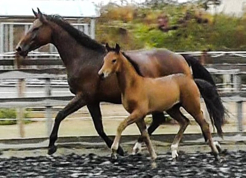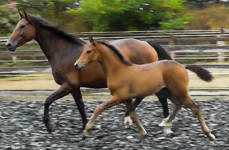 Fünf Sterne S von Freigeist a. d. Londontimes Lola S v. Londontime Hannoveraanse merrie | Bruin | 15.06.2022 geboren De naam zegt het al. Dit mooie, levendige merrieveulen heeft een bewegingskwaliteit in een klasse apart. Lichtvoetig, met veel energie, het toont een geweldige bewegingsdynamiek met een zeer goede neiging bergopwaarts. Met veel stuwkracht van de achterhand zweeft ze gewoon over de baan. Ze heeft veel energie en plezier in bewegen. Alle drie de basisgangen zijn van uitzonderlijke kwaliteit. Dit typey merrieveulen is slim, zelfverzekerd en mensgericht, ze heeft het veulen ABC op een speelse manier geleerd, wormen genezen, leiden of zich voorstellen aan de smid is voor haar geen probleem. Ze groeide bij ons op op de boerderij. De paarden staan in de kudde 24/7 in de wei in de zomer en in groepsbeweging in de winter. De moedermerrie heeft een hoogte van een goede 170 cm, dus we verwachten een uiteindelijke grootte van het veulen van 1,60 m / beginnend 1,70 m. We runnen een kleine fokkerij. Alle paarden hebben familiebanden, zijn mensgericht en worden met veel kennis en hart opgevoed en getraind. De veulens worden voorzichtig en zorgvuldig gespeend, de opvoeding en training vindt plaats met kennis van het paard en leergedrag met veel liefde en zonder dwang. Het veulen wordt in geschikte, ondersteunende handen geplaatst. Bij de verkoop bereiden we het veulen voor op scheiding en transport, wat betekent dat we een beetje doorlooptijd nodig hebben - vandaag kopen, morgen ophalen zal moeilijk zijn. Er is ook de mogelijkheid dat het veulen hier blijft voor de opfok. De vader Freigeist (v. Foundation) behoort tot de jonge hengstenstam van de Nedersaksische Staatsstoeterij en werd onlangs bekroond met de World Meyer Prize. Meer informatie over fokken en opfokken vindt u op onze website schroetershof.de of bel ons.