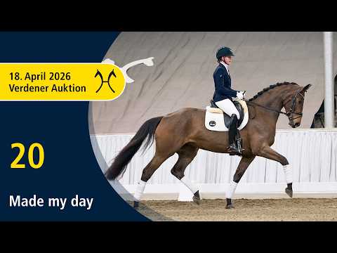 Das Pferd ist ein Verdener Auktionspferd und wird am 18.04.2026 onlive versteigert. Vom 6.04. bis zum 18.04. kann das Pferd jeden Tag beim öffentlichen Training besichtigt und ausprobiert werden. Das Startgebot bei der Versteigerung ist 8.000 Euro. MMade My Day empfiehlt sich mit einem ansprechenden Eindruck unter dem Sattel, großer Losgelassenheit und guten Grundgangarten. Für eine erfolgreiche Zukunft stehen ihr alle Türen offen. Urgroßmutter Lore stellte u. a. den gekörten Hengst Roosevelt von Rotspon (Olympische Spiele mit Allison M. Brock) sowie Rovell Royal, ebenfalls von Rotspon (Dressur: Grand Prix mit Bettina Haussels). Aus der Linie stammen zudem Winona v. Wolkentanz (Weltmeisterschaften der jungen Dressurpferde und erfolgreich in der Klasse M mit Sascha Schulz, Bundeschampionate mit Friederike Brünger). 1. Generation Auktionspferde: Freudenherz vom Leisch/Freudenherz vom Lei v. Fiji (FoVA 2025). Bes. Prämientöchter: HannPrA Cloe v. Confess Color. 2. Generation Auktionspferde: HannPrA Friday Midnight K v. Florencio I (VA 2015). 3. Generation Sportpferde Dressur: gek. Hengst Roosevelt/Roosevelt 37 v. Rotspon (DRE: int. Grand Prix mit Allison M. Brock,Olympische Spiele der Dressurreiter -Mannschaft- 2016,Grand Prix Special -international- 2015,Grand Prix -international- 2015,Verden 2005); Rovell Royal v. Rotspon (DRE: Grand Prix mit Bettina Haussels,Dressurprüfung Kl. S*** - Grand Prix de Dressage 2018,Dressurprüfung Kl. S*** - Grand Prix de Dressage 2016,Dressurprüfung Kl. S*** - Grand Prix Kür - 2016,Dressurprüfung Kl. S*** - Grand Prix de Dressage 2016,Dressurprüfung Kl. S*** - Grand Prix de Dressage 2014); Don Rovero v. Don Frederico (DRE: S** mit Andrea Sigling). Aufbauprüfungen Dressur: Rock on top 2 v. Rotspon (DRE: L). Bes. Prämientöchter: HannPrA Fusionistin/Furina Royal v. Fusionist; HannPrA Harmony v. Hochadel. 4. Generation Sportpferde Dressur: gek. Hengst Mister Universum/Mister Universum NRW v. FS Mr.Right (DRE: S** mit Mareike Mimberg-Hess,Bundeschampionat f. Reitponys 2015,Finalteilnehmer Bundeschampionat 3j.Reitponys 2015,Wickrath 2017); Flemming/Flemming 28 v. Fürst Piccolo (DRE: S** mit Celine Pruß); Fernando 694 v. Fidertanz (DRE: S* mit Anja Brinkel); Pelendur v. FS Pentagon (DRE: S mit Sylvia Sanchez); Dolce Vita 25 v. Dürkheim (DRE: S mit Wolf,Marcel,VA 1993); Borodin 18 v. Bolero (DRE: S mit Limbecker,Susanna); Belle Jolie 3 v. Benidetto (DRE: M* mit Kathrin Prasse); Wat Moi v. Wolkentanz (DRE: M* mit Karina Hell); Daisy von der Held v. Damon Hill (DRE: M* mit Emma Egbert); Domingo 562 v. Donnerhall (DRE: M* mit Gabriela Sonntag); Lisandra 4 v. Londontime (DRE: M* mit Friederike Brünger). Aufbauprüfungen Dressur: StPr Winona/Winona 28 v. Wolkentanz (DRE: M mit Schulz,Sascha,Dressurpf.Kl.L-WM Jg.Pferde 5j. 2004,Bundeschampionat f.Reitpferde m.M. 2002,Ratje Niebuhr-Schau Verden 2002,Bundesschau Neustadt/Dosse 2002); Frederico EQ v. Finest (DRE: L); Quintus Antonius v. Quantensprung (DRE: L). Besondere Sportergebnisse: StPrA Mrs. Universum d'Alpen/Mister's Sister v. FS Mr.Right (Finalteilnehmer Bundeschampionat 3j.Reitponys 2016). gekörte Hengste: gek. Hengst Dorniks Universum v. Dornik B (Wickrath 2023); gek. Hengst Don Leon/v. De L´Or v. De L'Or (Verden 2015); gek. Hengst Don Dinoso v. Don Gregory (Zweibrücken 2009). Auktionspferde: Baby Doll/Baby Doll 5 v. Benidetto (VA 2013); Weddingplaner v. Wolkentanz (VA 2008); Remtemtem v. Rohdiamant (VA 2003); Caruso 269 v. Carbid (VA 2001); Chestnut Queen v. Carbid (VA 2001); Racker v. Raphael (VA 1997); Westburg 2 v. Westwall (VA 1993). Bes. Prämientöchter: StPr Dinetti v. Dimaggio; StPr Florentine/Florentine 61 v. Florestan I. 5. Generation Sportpferde Springen: Angie/Angie 38 v. Alme Star (SPR: M mit Poesze,Klaus); GARFIELD FVW v. Grande (SPR: M mit GLEUE,LOTHAR). Mutter: Fleißiges Lieschen ZL: 6/6 Großmutter: Rosi ZL: 10/5 ZSP: Feldprüfung Reitpferd - Trab 6,50 Galopp 7,50 Schritt 7,50 / Durchschnitt Rittigkeit 7,75 / Durchschnitt Springen 6,00ade My Day empfiehlt sich mit einem ansprechenden Eindruck unter dem Sattel, großer Losgelassenheit und guten Grundgangarten. Für eine erfolgreiche Zukunft stehen ihr alle Türen offen. Urgroßmutter Lore stellte u. a. den gekörten Hengst Roosevelt von Rotspon (Olympische Spiele mit Allison M. Brock) sowie Rovell Royal, ebenfalls von Rotspon (Dressur: Grand Prix mit Bettina Haussels). Aus der Linie stammen zudem Winona v. Wolkentanz (Weltmeisterschaften der jungen Dressurpferde und erfolgreich in der Klasse M mit Sascha Schulz, Bundeschampionate mit Friederike Brünger). 1. Generation Auktionspferde: Freudenherz vom Leisch/Freudenherz vom Lei v. Fiji (FoVA 2025). Bes. Prämientöchter: HannPrA Cloe v. Confess Color. 2. Generation Auktionspferde: HannPrA Friday Midnight K v. Florencio I (VA 2015). 3. Generation Sportpferde Dressur: gek. Hengst Roosevelt/Roosevelt 37 v. Rotspon (DRE: int. Grand Prix mit Allison M. Brock,Olympische Spiele der Dressurreiter -Mannschaft- 2016,Grand Prix Special -international- 2015,Grand Prix -international- 2015,Verden 2005); Rovell Royal v. Rotspon (DRE: Grand Prix mit Bettina Haussels,Dressurprüfung Kl. S*** - Grand Prix de Dressage 2018,Dressurprüfung Kl. S*** - Grand Prix de Dressage 2016,Dressurprüfung Kl. S*** - Grand Prix Kür - 2016,Dressurprüfung Kl. S*** - Grand Prix de Dressage 2016,Dressurprüfung Kl. S*** - Grand Prix de Dressage 2014); Don Rovero v. Don Frederico (DRE: S** mit Andrea Sigling). Aufbauprüfungen Dressur: Rock on top 2 v. Rotspon (DRE: L). Bes. Prämientöchter: HannPrA Fusionistin/Furina Royal v. Fusionist; HannPrA Harmony v. Hochadel. 4. Generation Sportpferde Dressur: gek. Hengst Mister Universum/Mister Universum NRW v. FS Mr.Right (DRE: S** mit Mareike Mimberg-Hess,Bundeschampionat f. Reitponys 2015,Finalteilnehmer Bundeschampionat 3j.Reitponys 2015,Wickrath 2017); Flemming/Flemming 28 v. Fürst Piccolo (DRE: S** mit Celine Pruß); Fernando 694 v. Fidertanz (DRE: S* mit Anja