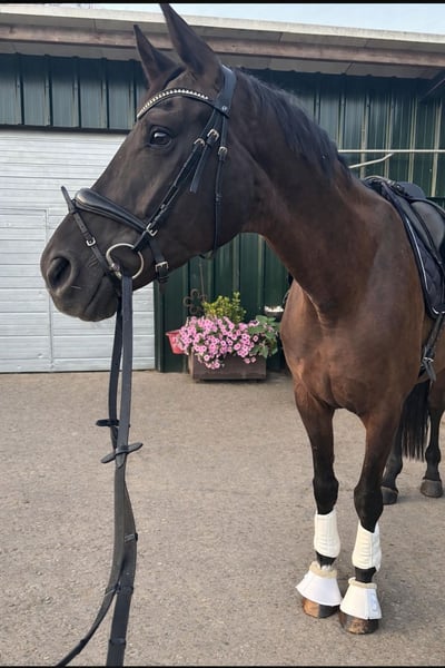 Hannoveraner mare, 4 years old (soon 5) – Fendi x Sandro Hit x Weltmeyer x Florestan We are offering a promising Hannoveraner mare, 4 years old (soon 5), with high-quality dressage bloodlines: sire Fendi x Sandro Hit, dam Weltmeyer x Florestan. Despite her young age, she is very well-behaved and easy to handle. In daily interactions, she is calm, friendly, and uncomplicated. Under saddle, she is honest and willing, though still young and inexperienced due to her age. She requires a confident, consistent rider who can provide clear guidance and continue her training calmly. Not suitable for beginners, as she – like any young horse – needs a reliable leader. With appropriate confidence from the rider, she proves to be reliable and pleasant. The mare has good basic gaits and an age-appropriate training level. She offers excellent potential for further dressage development and is of interest to both ambitious leisure riders and aspiring dressage riders. A health certificate (Züchter-TÜV) without findings is available from early 2024. On her front left leg, she has a small benign swelling, which is purely cosmetic and does not affect her in any way. A suitable, supportive home is sought where she can be further educated with fairness, consistency, and patience. Further information, photos, and videos available upon request.