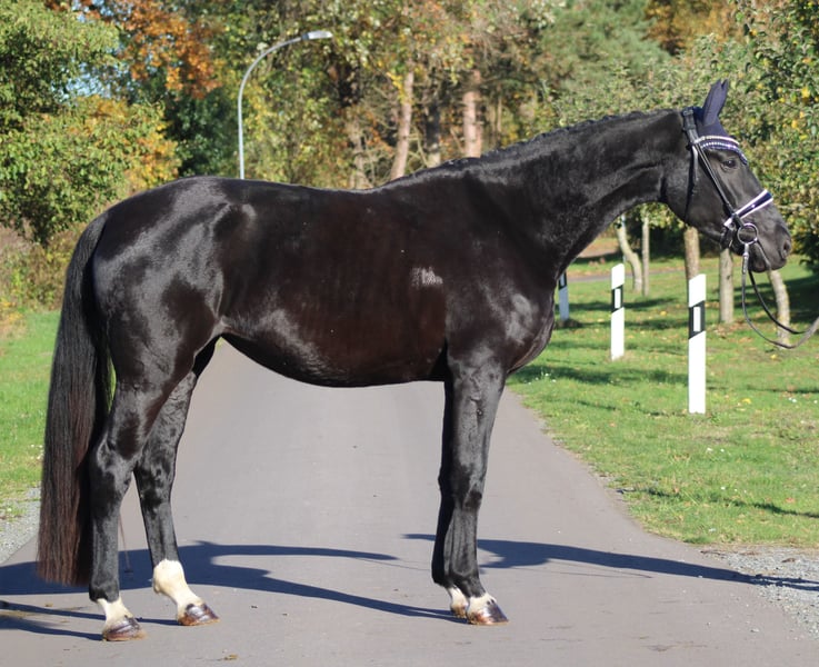 Direkt vom Züchter steht diese großrahmige Stute. Sie ist ca 172/173 cm groß zur Zeit und gut angeritten. Ein Röntgentüv gibs bereits. Brav im Umgang und auch beim reiten. Schmied und verladen ist bei uns kein Problem. Standort 27446 Deinstedt