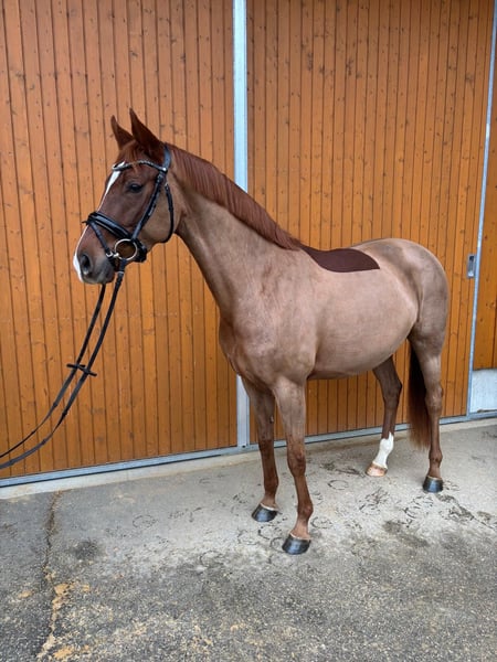 *Felicia* Diese wunderschöne Fuchsstute wurde im Jahr 2021 geboren und überzeugt durch ihr freundliches Wesen sowie ihre beeindruckende Erscheinung. Durch ihre raumgreifenden Grundgangarten und ihren motivierten Charakter bietet sie die perfekten Voraussetzungen für ambitionierte Reiterinnen und Reiter, die ihre Dressurkarriere vorantreiben möchten. Auch als Nachwuchspferd für Jugendliche wäre Felicia geeignet. Sie wird der Zuchtlinie entsprechend im Dressursport ausgebildet und zeigt bereits viel Talent. Bei einem Freilaufcup konnte sich Felicia den zweiten Platz sichern, bei ihrem ersten Turnier (Reitpferdeprüfung 2025) wurde sie dritte und somit platziert. Ihre angenehme Art macht sie zu einer zuverlässigen Partnerin im täglichen Training und bei Turnieren. Neben der Eignung als Sportpferd, ist Felicia zudem Interessant für die Zucht. Bei der Stutleistungsprüfung erlangte sie eine Gesamtnote von 8,22 und schenkte uns 2025 Jahr ein prämiertes Stutfohlen von Va Bene (siehe letzten beiden Fotos und Video). Die Stute ist gesund, regelmäßig geimpft und frei von Krankheiten. Sie ist gut im Umgang und lässt sich problemlos bei Tierarzt, Schmied und Zahnarzt vorstellen. Ein TÜV liegt aktuell nicht vor. Bei Interesse stehe ich gerne für weitere Informationen zur Verfügung. Ein Probereiten ist nach Vereinbarung möglich. Gerne per WhatsApp unter +4915560581906.