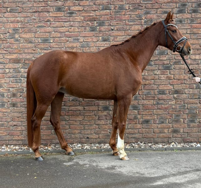 Gut gezogene handliche Stute mit tollem Trab und Galopp. Die Stute befindet sich aktuell in Ausbildung und wird vorbereitet auf ihren ersten Start in Dressurpferde A. Im Umgang ist sie ganz brav, beim Reiten muss man sich durchsetzen können, da sie manchmal ihren eigenen Kopf haben kann. Sie geht leicht am Zügel und ist gut zu sitzen. Ein guter aktueller Tüv liegt vor.
