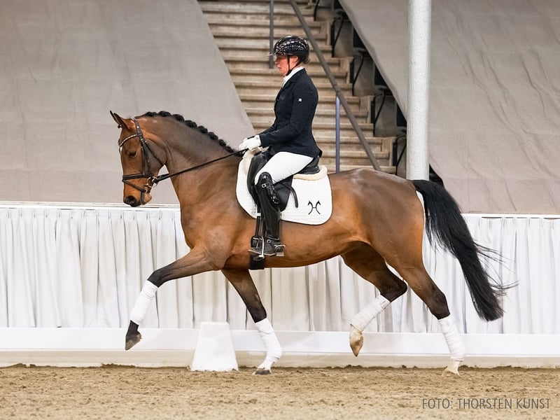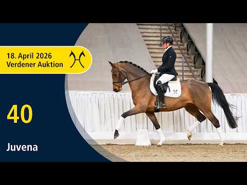 Das Pferd ist ein Verdener Auktionspferd und wird am 18.04.2026 onlive versteigert. Vom 6.04. bis zum 18.04. kann das Pferd jeden Tag beim öffentlichen Training besichtigt und ausprobiert werden. Das Startgebot bei der Versteigerung ist 8.000 Euro. Juvena ist aufgrund ihrer Größe ideal als Junioren- oder Damenreitpferd. Hohe Rittigkeit und großer Reitkomfort machen sie zur perfekten Partnerin. Ihr Talent für das Dressurviereck wird durch einen erfolgreichen Mutterstamm untermauert, angeführt von Funrise FRH (S*** mit Tessa Frank), Springsteen (S* mit Emma Gömmer) sowie dem gekörten Hengst Fürst Furioso 2 (S* mit Maja Schnakenberg). 2. Generation Sportpferde Dressur: Feldwebel HAKA von Velen/Funrise FRH v. Flanell (DRE: S*** mit Tessa Frank,Dressurpferdeprfg. Kl.S -Bundeschampionat 7 jährige 2023,VA 2018); gek. Hengst Fürst Furioso/Fürst Furioso 2 v. Bretton Woods (DRE: S* mit Maja Schnakenberg,Verden 2015,FoVA 2013,HM 2015); Bailey von Velen v. Bonifatius (DRE: M* mit Charlotte Corinna Koeppen). Bes. Prämientöchter: HannPrA Roulette QS v. Radius. 3. Generation Sportpferde Dressur: Habanero Uno v. Hotline (DRE: S* mit Yasmin Landau,VA 2012); Springsteen 11 v. Sir Donnerhall I (DRE: S* mit Emma Gömmer); Enio G v. Escolar (DRE: M* mit Marie Brisseau). Aufbauprüfungen Dressur: Glamourgirl G v. Glamourdale (DRE: L); gek. Hengst Geronimo G/Geronimo 760 v. Glamourdale (DRE: L,MS-Handorf 2021); HannPr Evita G v. Escolar (DRE: L). Auktionspferde: StPr Fürstin Hohenstein v. Fürst Heinrich (FoVA 2004,VA 2008); Fürstin Lewitz/Fuerstin-Hohenstein v. Fürst Heinrich (FoVA 2002). Bes. Prämientöchter: HannPrA Rosalie QS v. Raven; HannPrA Lillifee G v. Lord Loxley; StPr For Fantasy v. For Compliment; StPr Fürstin-Hohenstein III v. Fürst Heinrich. 4. Generation Sportpferde Springen: Cassia BM v. Canstakko (SPR: 1,40 m mit Marie Luise Mohr). Bes. Prämientöchter: StPr Habanera v. Hohenstein. 5. Generation Sportpferde Dressur: Loreley/La Lili v. Lord Fauntleroy (DRE: M* mit Milena Lustig,SPR: 1,30 m mit Milena Lustig). Sportpferde Springen: Following Dream D v. For Edition (SPR: 1,50 m mit Dirk Klaproth); Contessa D/Contessa D 2 v. Chasseur I (SPR: int. 1,40 m mit Silke Kröckel); Chardonnay 116 v. Chacco Chacco (SPR: 1,45 m mit Calvin Böckmann,Springprfg.Kl.S m.St.** Bundeschampionat 7 jährige 2023,Springprfg.Kl.M** m.St. Bundeschampionat 6 jährige 2022,Spezialspringpferdeprfg. Kl.M* m.2 Uml. Bundeschampionat 5 jährige 2021); Goombay Dancer v. Grand Cru (SPR: 1,40 m mit Ilona Mäkipere); Alinea/Argentinia 8 v. Argentan (SPR: 1,40 m mit Hess,Christian); Clintea v. Clintord I (SPR: 1,35 m mit Sophia Alff,FoVA 2009); Queen-D/Queen -D v. Quaid I (SPR: 1,35 m mit Katharina Rohn); Loreley/La Lili v. Lord Fauntleroy (DRE: M* mit Milena Lustig,SPR: 1,30 m mit Milena Lustig); Nena Love v. Nerrado (SPR: 1,30 m mit Katharina Seroka). Aufbauprüfungen Springen: Casalino 7 v. Casallato (SPR: 1,30 m mit Marie Terhoeven-Urselmans); Stradivari 34 v. Stanley (SPR: L); Frieda/Flying Dream D v. For Edition (SPR: L). Auktionspferde: Conny D v. Comte (VA 2018). Bes. Prämientöchter: StPr Auenmelodie/Amabilis 2 v. Argentan. Mutter: Symphonie D'Amour ZL: 2/1 Turniererfolge: DRE: A 1/1. DPF: A 1/1. 1/4. Großmutter: Fürstin-Hohenstein III Prämierung: 1xIa. ZL: 11/8 ZSP: Feldprüfung Reitpferd - Trab 8,50 Galopp 8,50 Schritt 7,50 / Durchschnitt Rittigkeit 8,00 / Durchschnitt Springen 7,00