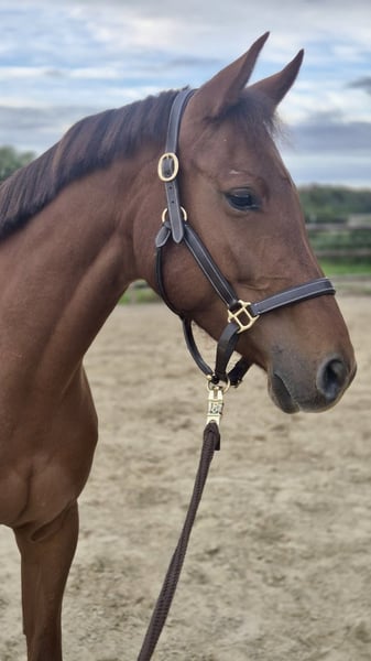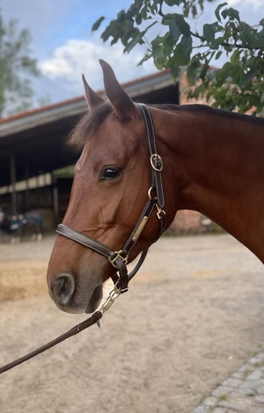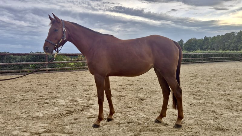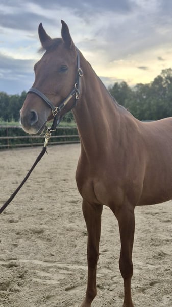 I am reluctantly selling my 5-year-old mare Komme Belle, known as Kathy, as a breeding mare. She is approximately 1.65m tall. She has been in my possession since she was 2.5 years old. Due to a diagnosis in her cervical spine (from a fall), Kathy is unfortunately no longer rideable, or only conditionally rideable. The diagnosis has been clarified by a veterinarian, and X-rays can be provided. Kathy has an excellent pedigree with top jumping blood and a great character. When being started under saddle, Kathy showed herself to be very willing to learn, learned quickly, and was very rideable. She has good basic gaits as well as a good free jump. Kathy's mother competed up to S-level jumping and was qualified for the Bundeschampionat. Kathy windsucks, so she should be kept in a pasture or open stable, where she hardly windsucks at all. She is familiar with being in a box. She knows herd living and is rather low-ranking and always friendly. Due to her diagnosis, no trailer training has been done, but she travels well in a standing transport.