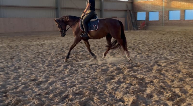 Zum Verkauf steht eine talentierte Hannoveraner Stute, geboren im Jahr 2020. Sie präsentiert sich in einem auffälligen Fuchs-Fell und hat ein Stockmaß von 164 cm. Sie zeigt bereits vielversprechende Ansätze in der Arbeit unter dem Sattel und hat einen super lieben, lernwilligen Charakter. Sie wurde erst spät eingeritten, weil ich ein Kind bekommen habe und mehrfach gesundheitlich ausgefallen bin.