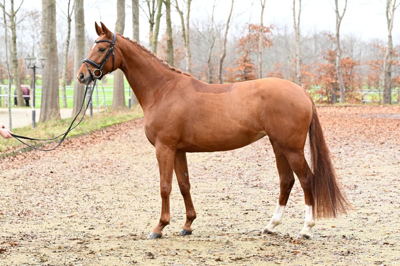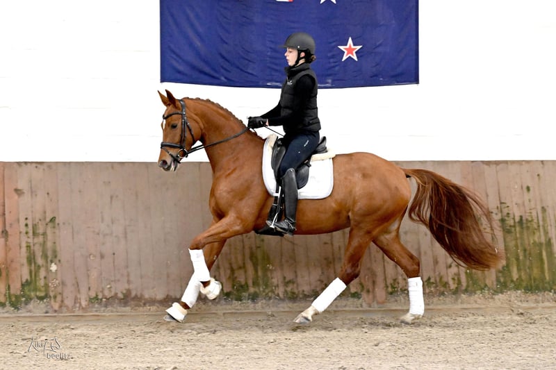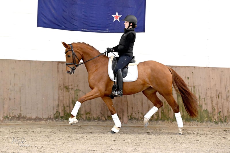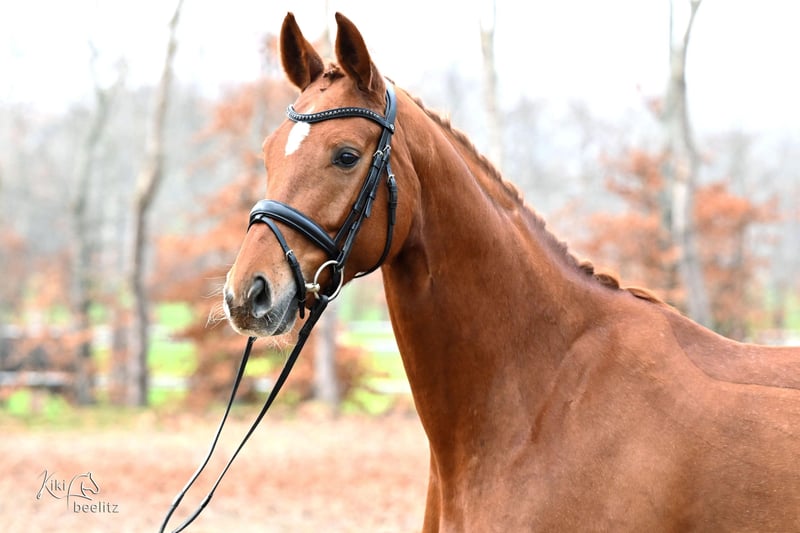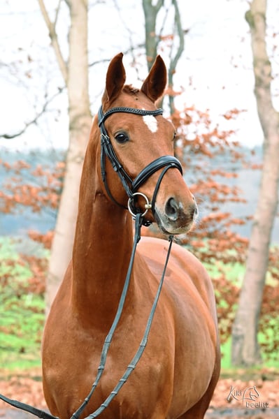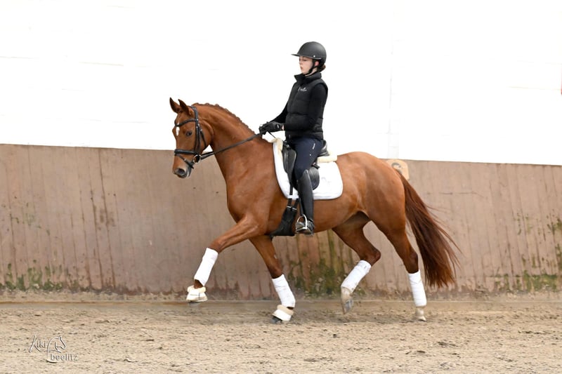 For sale is an elegant and promising mare, born in 2021. She is a beautiful mare with an excellent conformation. This talented horse is ideal for dressage and already demonstrates a high level of movement quality as well as a solid basic training. She impresses with her friendly nature, willingness to learn, and her spirited character. Scusa has already proven herself successfully in competitions, having won a riding horse test and placed second in Dressage Horse Class A. Additionally, she enjoys hacking out in the terrain. A recent, very good X-ray TÜV is available. Please feel free to contact me for more information or to arrange a viewing.