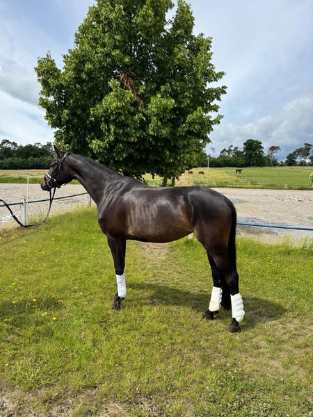Sehr feine Stute mit guter Bewegung in allen 3 GGA. Sie ist erst seit 3 Monate unter dem Sattel und Sie hat jeden Tag Spaß an der Arbeit.