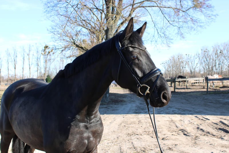 Elegant Hanoverian mare for sale – perfect for dressage! This beautiful dark mare was foaled in 2021 at Klostergut and impresses with her striking appearance and promising potential. Standing at 16.1 hh, she offers an ideal size for ambitious riders looking to progress in dressage. She has a strong character, is eager to learn, and possesses an excellent basic training. Her elegant appearance and pleasant temperament make her an ideal partner for the dedicated dressage rider. Please feel free to contact me for more information or to arrange a viewing.