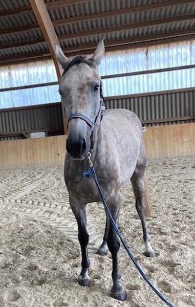 Our three-year-old mare is versatile, bred for jumping and good to handle. She has already been lunged with a saddle. Please contact us for further information.