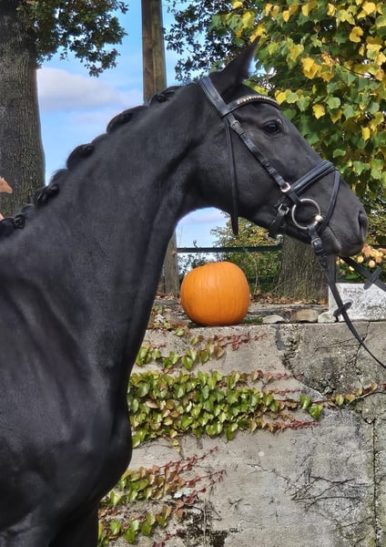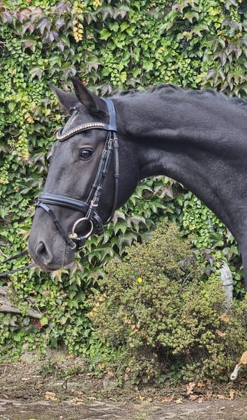 Modern, leggy black mare with three excellent basic gaits and outstanding rideability. She also possesses a truly friendly, people-oriented temperament. We are looking for a supportive and loving new home for this dream horse. A recent TÜV report without findings, including X-rays of the back, is available. In training for three months; the price will increase with further education. If interested, please contact us exclusively by phone or WhatsApp at 01744022800.