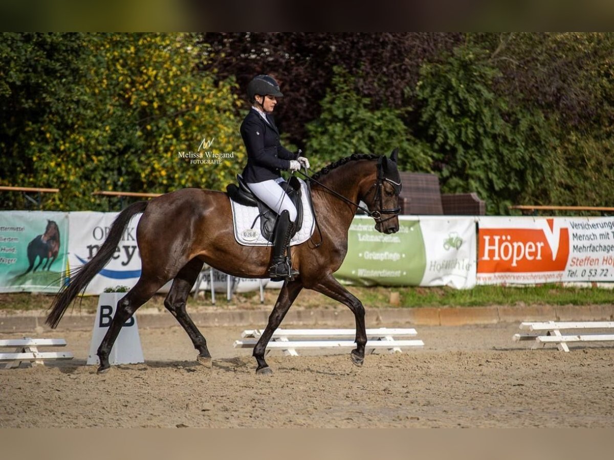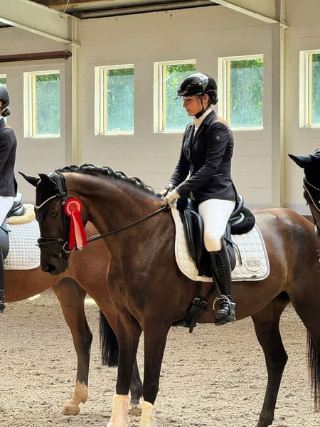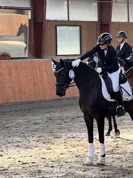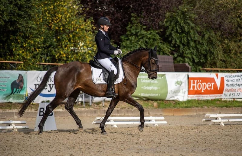 Zum Verkauf steht, direkt aus Züchterhand, eine äußerst elegante und rittige Estobar NRW-Tochter, die mit viel Qualität, hervorragender Einstellung und klarer Perspektive für den Dressursport überzeugt. Die Stute wurde aufgrund ihrer späten körperlichen Entwicklung bewusst schonend ausgebildet und ist erst seit Dezember 2024 unter dem Sattel. Dafür zeigt sie sich heute umso weiter gefördert: Sie konnte sich bereits mehrfach in Dressurprüfungen der Klasse A platzieren und ist inzwischen sicher auf Dressurpferde L-Niveau angekommen. Zudem lässt sie ihr Talent für die Wechselarbeit bereits deutlich erkennen und bietet damit beste Voraussetzungen für den weiteren Weg in Richtung Klasse M. Unter dem Reiter präsentiert sie sich mit: • sehr guter Rittigkeit • feiner Anlehnung und angenehmem Go • hoher Lernbereitschaft • sitzbequemem Bewegungsablauf Mit ihrem handlichen Stockmaß von ca. 1,60 m im modernen, eleganten Hengsttyp ist sie besonders für ambitionierte Reiterinnen und Amateure ein ideales Sportpferd. Im täglichen Umgang sowie auf dem Turnier zeigt sie sich absolut brav, unkompliziert und nervenstark – auch in fremder Umgebung jederzeit zuverlässig und gut regulierbar. Sie kann sowohl barhuf als auch beschlagen vorgestellt werden und verfügt über sehr gute Hufe. In der Herde ist sie rangtypisch und daher nicht für eine reine Zweierkonstellation geeignet. Diese Stute ist kein reines Nachwuchspferd mehr, sondern ein sofort einsetzbarer Sportpartner mit hervorragender Perspektive, der durch ihre Rittigkeit, Arbeitseinstellung und Leistungsbereitschaft besonders für den ambitionierten Amateurbereich hochinteressant ist. Weitere Informationen, Videos und Probereiten gerne auf Anfrage.