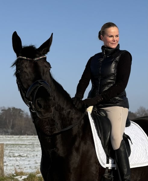 En esta yegua se combinan la máxima calidad y un linaje destacado en la doma clásica. Con Fürstenball x Weltmeyer, posee una sangre de rendimiento excepcional, una combinación que ha demostrado repetidamente su eficacia en logros y altas calificaciones en la doma. Ya ha obtenido una colocación en la categoría de Doma A, y eso en su segunda participación en concursos. La yegua es muy fácil de montar, valiente y se destaca por un paso enorme, un amplio sobretrén y tres movimientos básicos expresivos. Nuestra “Fiffy” es una verdadera joya. Muy cómoda de montar. Extremadamente inteligente (aprende las lecciones de doma en la categoría L como si nunca hubiera hecho otra cosa). Lejos de ser inquieta o nerviosa, no es glotona ni nerviosa. ¡Un compañera para todos los proyectos! Véase la foto con mi hija en el campo. ;-) Una perspectiva muy interesante en doma para la próxima temporada. Extremadamente ligera, clara de cabeza y sencilla en su manejo. El TÜV fue excelente en su primer año, aunque naturalmente debe ser renovado. Nunca ha estado enferma ni ha presentado problemas. Siempre ha sido muy sana y clara.