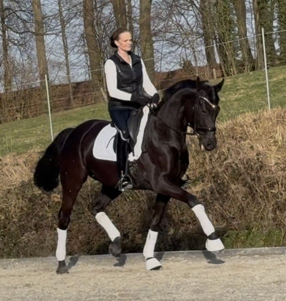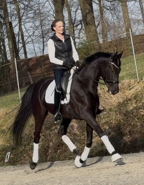 In questa fattrice si combinano la massima qualità e un'eccellente genealogia da dressage. Da Fürstenball x Weltmeyer, possiede il miglior sangue da prestazione – una perla nero corvino, molto interessante anche dal punto di vista riproduttivo. È già piazzata nella categoria Dressurpferde A, e ciò già al suo secondo debutto in gara. La fattrice è molto facile da cavalcare, coraggiosa e si distingue per un passo molto grande, un'ampia articolazione e tre andature di base molto espressive. Di ottimo carattere, con un'altezza stimata di circa 1,70 m, è ancora in piena crescita e sicuramente continuerà a svilupparsi positivamente. Una prospettiva di dressage molto interessante per la prossima stagione. Estremamente leggera nei movimenti, lucida di testa e facile da gestire. Il TÜV è stato eccellente a un anno, naturalmente dovrà essere ripetuto! Non è mai stata malata o problematica. Sempre molto lucida e in salute.
