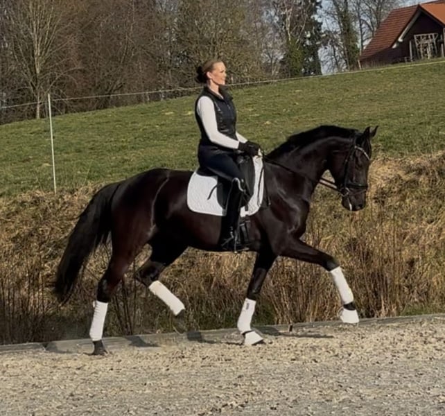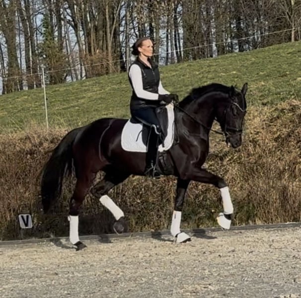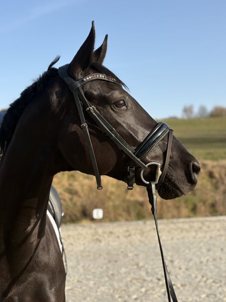 This mare combines top quality with an outstanding dressage pedigree. Bred from Fürstenball x Weltmeyer, she carries excellent performance bloodlines – a jet-black gem that is also highly interesting from a breeding perspective. She has already been placed in Dressage Horse A, and that was at only her second competition. The mare is very easy to ride, fearless, and impresses with a very expressive trot, generous overtracking, and three expressive basic gaits. With a friendly temperament and an estimated height of around 1.70 m, she is still fully developing and is expected to continue to improve positively. A highly promising dressage prospect for the upcoming season. Extremely light-footed, clear-minded, and easy to handle. Her TÜV was excellent at one year old, but of course, it needs to be renewed! She has never been ill or showed any abnormalities. Always healthy and in perfect condition.