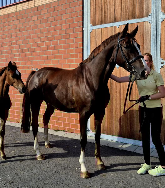 Here you have the opportunity to acquire a stunning dark chestnut mare by Rotspon x Salvano x Westerland, in foal for May to Segantini Due (Secret x Fidermark). Currently, she still has a foal by Bon Succes (born April 30, 2025) at her side. She can also be purchased together with the foal and in foal for €10,000. Viewings are possible at any time by appointment. Please feel free to contact us if you are interested or have any questions.