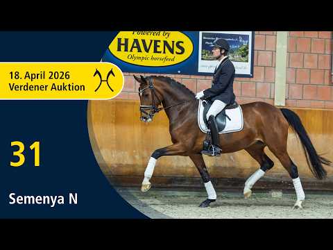 Das Pferd ist ein Verdener Auktionspferd und wird am 18.04.2026 onlive versteigert. Vom 6.04. bis zum 18.04. kann das Pferd jeden Tag beim öffentlichen Training besichtigt und ausprobiert werden. Das Startgebot bei der Versteigerung ist 8.000 Euro. Eine hochinteressante Blutanpaarung, die sich bereits mehrfach als Volltreffer erwiesen hat: Mit Chic und Charme präsentiert sich Semenya N, ein Dressurpferd mit bester Empfehlung. Ihr Vollbruder Semenyo schrieb Auktionsgeschichte, verließ die Elite-Auktion 2023 als gefeierte Preisspitze und ist mit Alexandra Sessler siegreich in Dressurpferdeprüfungen der Klasse M. Auch mit Semenya N bieten wir Ihnen eine Dressurspitze mit hervorragenden Grundgangarten, bester Rittigkeit und großem sportlichen Potenzial. 1. Generation Aufbauprüfungen Dressur: Semenyo N v. Secret (DRE: M mit Alexandra Sessler,VA 2023: 140.000 €); Finest Fay 2 v. For Romance I (DRE: L). 2. Generation Sportpferde Dressur: Fantasimo v. Fiorano (DRE: int. Grand Prix mit Milena Sulzer,Grand Prix Kür -international- 2023,Nationenpreis Dressur Kl.S Junge Reiter -international- 2022,Nationenpreis Dressur Kl.S Junge Reiter -international- 2021); gek. Hengst Balesteros v. Belissimo M (DRE: Grand Prix mit Pia Virginia Fortmüller,Bundeschampionat f. Reitpferde 2010,München-Riem 2009); Belinja/Belinga 2 v. Belissimo M (DRE: M** mit Bernd Nöthen); gek. Hengst In My Mind/In My Mind NRW v. Asgard's Ibiza (DRE: M mit Leonie Richter,Dressurpferdeprfg. Kl.M Bundeschampionat 6 jährige 2023,MS-Handorf 2019). Aufbauprüfungen Dressur: gek. Hengst Valparaiso/Valparaiso 11 v. Viva Gold (DRE: L,MS-Handorf 2022); It's me Ivy v. Asgard's Ibiza (DRE: L); Celerina/Celerina 7 v. Chagall (DRE: L); Bollettieri v. Belissimo M (DRE: L). Aufbauprüfungen Springen: Shelby 11 v. San Remo (SPR: L). gekörte Hengste: gek. Hengst Special One v. Schwarzgold (Kreuth 2015). 3. Generation Sportpferde Dressur: Don't do it 2 v. Don Romantic (DRE: Grand Prix mit Maurice Krüger,Dressurprüfung Kl. S*** - Grand Prix de Dressage 2021); Elite StPr Fiona/Fiona 500 v. Florestan I (DRE: S* mit Anne Sophie Müller); Jesse James 27 v. Jazz Rubin (DRE: S* mit Mate Garai); Royal Flyer v. Royal Diamond (DRE: M** mit Dennis Heck); StPr Santa Fee/Santa Fee 145 v. Sandro Hit (DRE: M** mit Jörg Dietrich); Svenson TB v. Sandro Hit (DRE: M* mit Tina Blumenhagen); Ratino/Ressino v. Rousseau (ex: Rambo) (DRE: M* mit Felizitas Hesse-Lange); StPr Francesca/Francesca 31 v. Florestan I (DRE: M* mit Tina Blumenhagen); Leroy 122 v. Laurentianer (DRE: M* mit Martin Agevall). Sportpferde Springen: Balmoral/Baloubet 3 v. Balou du Rouet (SPR: 1,50 m mit Michael Symalla); Happyness/Happyness 29 v. His Highness (SPR: 1,30 m mit Lena Abraham); Davignon 2 v. Der Clou (SPR: M mit Driedger,Henning). Aufbauprüfungen Dressur: Tokyo F v. Temptation (DRE: L). 5. Generation Sportpferde Dressur: Papillon 118 v. Placido (DRE: S* mit Claudia Klaßen). Sportpferde Springen: Captain Corlando v. Cornet Obolensky (Windows v.h.Costersv.) (SPR: 1,55 m mit Luca Ruxandariu,GRAND PRIX CSI2*-W 2025,METLEN Grand Prix 2025); Mr.Sunshine 4 v. Monsieur (SPR: 1,45 m mit Frank Volke); Alter Ego 2 v. Cornet Obolensky (Windows v.h.Costersv.) (SPR: 1,40 m mit Alexa Stais); Miree/Melodie 217 v. Monsieur (SPR: 1,40 m mit Krogmeier,Rene); v. Coperphild (SPR: 1,35 m mit Artem POLISCHUK); Liquido 35 v. Lamoureux I (SPR: 1,30 m mit Philipp Klose); Punt E Mes v. Perlkönig I (SPR: M mit Sommer,Hans). Aufbauprüfungen Springen: Paddington 106 v. French Buffet (SPR: 1,30 m mit Johanna Schulze Thier); LS-S Lady/Lisabo v. Landadel (SPR: M mit Bahne,Sandra ter); gek. Hengst Charles van Schotten v. Comme il faut NRW (SPR: L,Hoftermin 2023); VbPr Cathleen/Cathleen 46 v. Captain Fire (SPR: L); Corlandina v. Cornet Obolensky (Windows v.h.Costersv.) (SPR: L); Cornet's Fire v. Cornet Obolensky (Windows v.h.Costersv.) (SPR: L); Cassius Clay H v. Coronas (SPR: L). gekörte Hengste: gek. Hengst Abwehr/ABWEHR v. Angriff (Münster 1980). Mutter: Belinja ZL: 7/6 Turniererfolge: DRE: M 1/5. DRE: L 1/1. DPF: A 1/5. RPF: ohne Klasse 1/2. 1/w. Großmutter: Discovery ZL: 15/13 Weitere Vorschläge