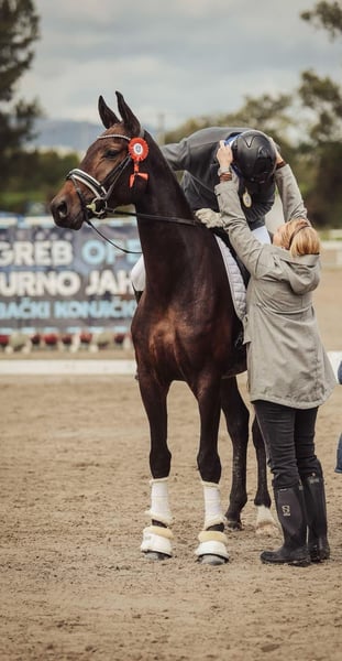 Fürstin Fiona- A stunning 16.3hh 5 year old Hanoverian mare looking for a new home. She is a Fürst Samarant/Dancier mare, born on 20.02.2020, dark bay, at the same home since birth as well as professionally backed and trained. She is unbelievably well-behaved and fearless, yet still has enough “go.” Very soft in the hand, not strong at all—rather sensitive and refined. She is familiar with hacking out both alone and with other horses and remains very well-behaved. She also enjoys small free jumping. She hacks alone or in company. She has three good basic gaits, a dynamic and elastic trot, and a large uphill canter. The mare was carefully backed and was introduced to competitions in 2024, with 3 starts and 3 wins, including a riding horse test victory with a score of 8.3. She can already perform counter-canter, and is on her way to Drpf. L level, so she will soon be ready for the season (next competition planned for 12.04.). She passed a full vet check at 3 years old without any findings. She is a Hanoverian, registered in the Hanoverian studbook and has a Hanoverian horse passport. Horse-friendly, and supportive home is essential for Fürstin Fiona. Everything available to view and try if you can travel to the yard, nearest airport is Zagreb. Potential buyers need to WhatsApp us a video of their riding ability through to - Click here to reveal phone number - nd we can assess suitability. Located in Northern Croatia, 150km from Graz. Worldwide shipping available please contact us for a quote. Price €22,000 Euro or £18,390 Sterling approximately on day of sale. Ref CMC