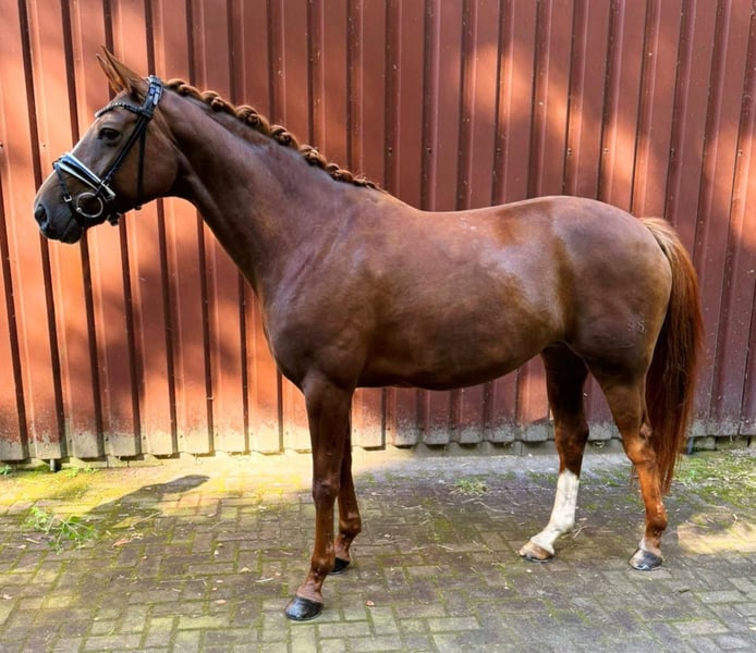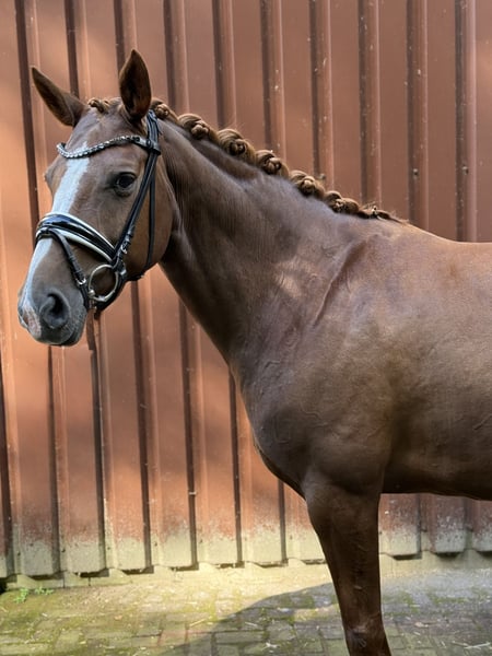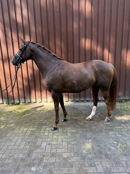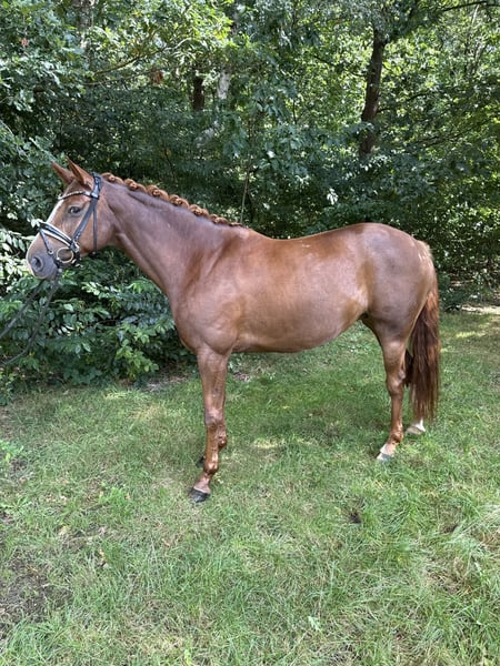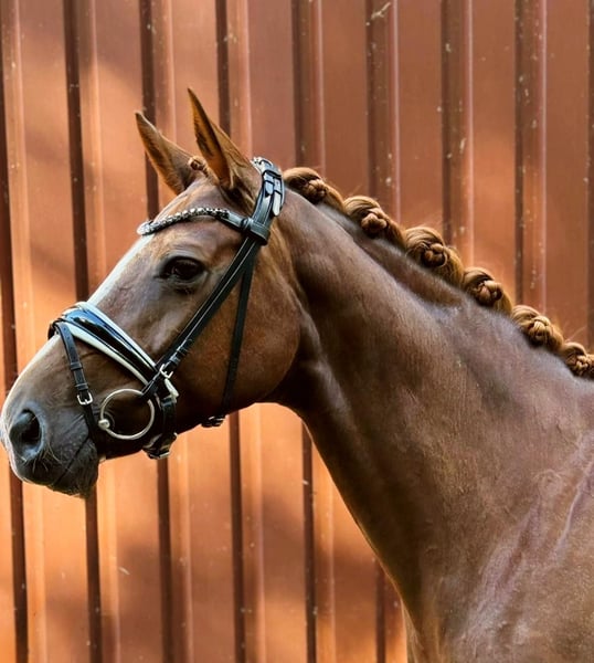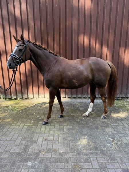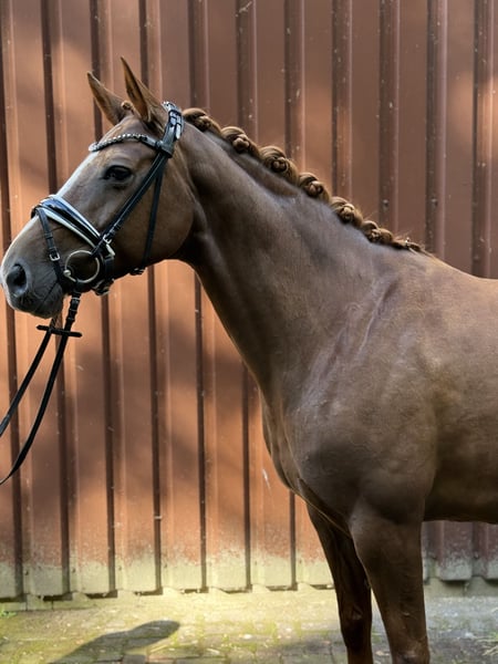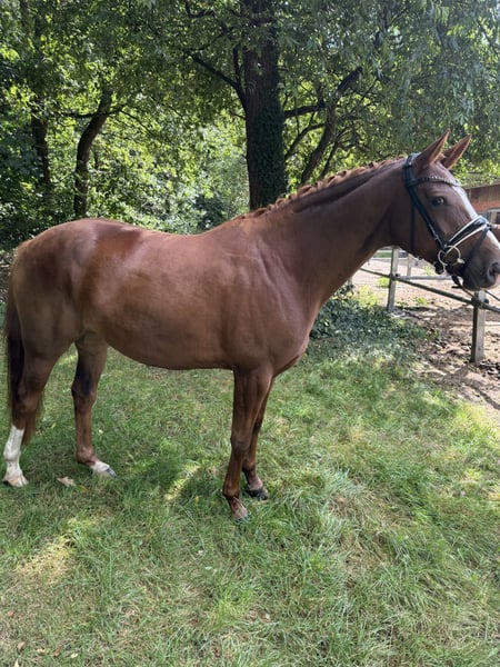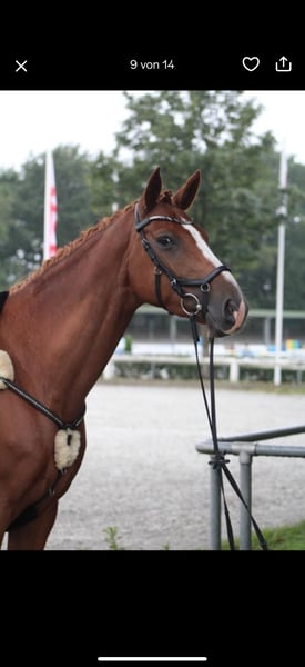 With a heavy heart, we have decided to find a 5-star home for our 7-year-old Hanoverian mare Flora (by Floris Prince x Locksley II). Flora is 1.66 m tall and already has numerous competition successes in dressage from E to A**, including a presentation in Dressurpferde L. As she does not enjoy show jumping, she will be sold exclusively as a dressage horse. She confidently masters the extended canter and flying changes, and she takes cross-country jumps with ease. Flora can sometimes be a bit "mare-like" and therefore needs an experienced, confident handler who can provide her with trust and security. She is not suitable for children, beginners, or re-riders. As a balance, she enjoys relaxed hacks – both in a group and alone. In the water, she behaves impeccably and always carries her rider reliably. She behaves exemplary with the farrier and veterinarian. Loading and traveling in a trailer is possible without any issues – whether alone or with another horse. Even when a second horse is unloaded, Flora remains calm in the trailer. Flora prefers to be outside a lot and feels most comfortable in a paddock or open stable. She is sensitive to dust, so her stable should be appropriately adjusted. Flora will only be given to the best, experienced hands. A sale to dealers or riding schools is not an option. I wish for her a home that matches her quality and character – because she deserves only the best. If Flora has sparked your interest, I look forward to a brief introduction from you, your expectations, and the living conditions. Videos can be sent upon request. For further questions, please feel free to contact: +49 151 29538967.
