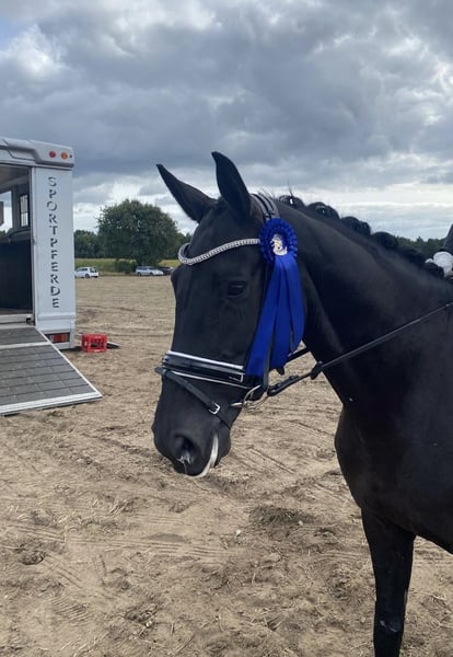 Deborah is a charming 5-year-old mare with excellent basic gaits and lots of potential. She comes from our own breeding program, was carefully broken in and trained with care, has not experienced anything bad in her life and follows her rider willingly and full of trust. She is worked indoors and outdoors, is easy to ride in the field, was able to convince at her first show at the first attempt and was placed at novice dressage level. She has presented herself without fear or nervousness, loading is completely problem-free. X-rays available. If you are interested, please contact me by phone or WhatsApp 0170-9316952