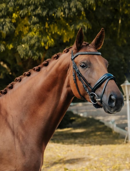 Qualitätsvolle, bildschöne Dressurstute von Destacado FRH x Rubin Royal mit viel Potenzial, viel Halsaufsatz und Ausdruck, optisch ganz der Vater. Ausbildungsstand ist bis Klasse S, bis 2er Wechsel, 1er Wechsel angetestet. Sie bringt viel Talent für Passage mit und ist 6jährig schon Sieg und erfolgreich in Jungpferdeprüfungen, sowie Klasse M/Kandare. Neben ihrer großen Bewegungsqualität, besticht Sie durch ihren Sitzkomfort, ihre Rittigkeit, ihr unkompliziertes Handling, sowie Nervenstärke. Die Stute, wie auch schon ihre bis S erfolgreiche Mutter, befindet sich seit Geburt in einer Hand und Ausbildung. Ein Pferd für sowohl den Children und Juniorensport, wie auch für die weitere Ausbildung in Richtung Grand Prix. Für weitere Informationen und Videos melden Sie sich gerne bitte telefonisch unter der 0172/5921136.