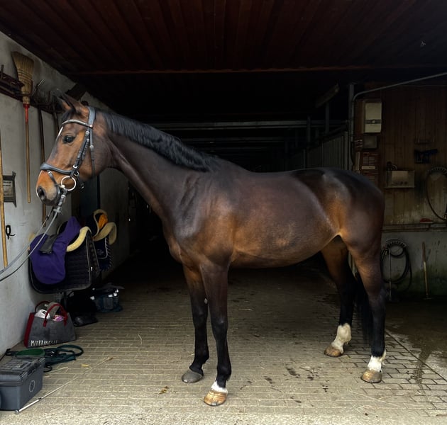 Ferrera is a 7-year-old mare by the movement sire Foundation, out of a Royal Classic x Sandro Hit dam. She is an incredible powerhouse, impressing with her three excellent basic gaits, all rhythmical and characterized by plenty of scope — a true eye-catcher! Due to her size, she was started relatively late and is currently competing at solid A-level, progressing towards class L. Last year, she competed in Dressage Horse A and placed third outright. She was very well-behaved and obedient during the test. Ferrera is a real diamond in the rough, with great potential to excel in the arena with the right rider. However, she is quite selective about her rider: she is very sensitive and does not tolerate nervous, jumpy, or tense riders. With sufficiently experienced riders who approach her with authority, calmness, consistency, and finesse, she performs flawlessly and truly enjoys her work, waiting to be challenged. It is essential that the rider understands that when the leg is lifted, the horse moves forward, rather than trying to accelerate with pressure. In addition, she is capable of a jump and is very brave and cool in the terrain. She is farrier- and loading-trusted, as well as herd-friendly. X-rays are available, including the back. Everything is fine except for a small bone growth on her front leg, which she has had for a year without any issues. She is regularly vaccinated and dewormed. Ferrera is only available to a top-quality home.