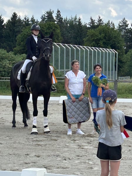Our "Franzi" is an elegant and modern mare with three excellent gaits, already placed multiple times and victorious in dressage horse competitions at classes A and L. She is on her way to class M. This 6-year-old, well-built mare impresses with her three very good gaits, her positive attitude, rideability, and outstanding willingness to perform. She has completed a solid basic training and shows great talent for further development. With her good pedigree and excellent character, she is an ideal partner for ambitious riders who value quality and performance. I am happy to provide videos and additional information by phone. Viewing and trial rides are available by appointment.
