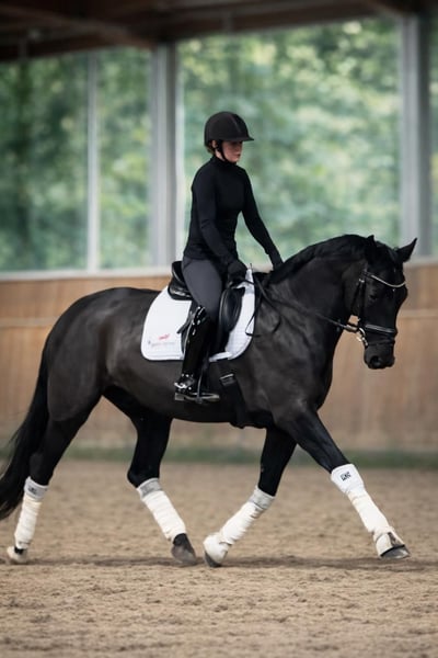 Zum Verkauf steht unsere geliebte „Black Pearl“ (auch „Fee“ genannt). Black Pearl ist eine Stute mit einem durchweg ausgeglichenen und freundlichen Wesen. Ob bei der Bodenarbeit, beim Fertigmachen am Putzplatz oder beim Reiten im Gelände sowie auf dem Platz – sie zeigt sich in jeder Situation zuverlässig und souverän. Sie lässt sich dressurmäßig fein an den Hilfen reiten, was eindeutig auf ihre Abstammung zurückzuführen ist. Gleichzeitig überzeugt sie auch im Parcours, wo sie stets motiviert und aufmerksam mitarbeitet. Dabei ist sie unerschrocken und ein echter Verlasspartner. Trotz ihrer ruhigen Art verfügt sie über ausreichend Vorwärtsdrang („Go“), den sie in der täglichen Arbeit stets positiv einbringt. Black Pearl ist sehr lernwillig, aufmerksam und auch neuen Situationen gegenüber aufgeschlossen. Sie möchte ihrem Reiter gefallen und bemüht sich stets, alles richtig zu machen. Insgesamt handelt es sich um einen vielseitigen Allrounder, der auch Geländehindernisse problemlos meistert. Ein aktueller TÜV liegt vor und weist keine Befunde auf, die einer sportlichen Nutzung entgegenstehen. Aufgrund familiärer Veränderungen und der daraus resultierenden Situation ist es uns leider nicht mehr möglich, sie weiterhin zu halten. Daher wünschen wir uns für sie ein liebevolles Zuhause, in dem sie einen Menschen oder eine Familie findet, die sie langfristig begleitet. Für weitere Fragen stehen wir Ihnen gerne zur Verfügung.