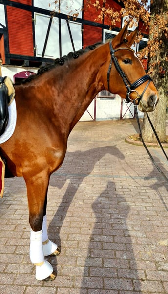 6 ans jument hanovrienne brune de haut niveau v. Carridam x Embassy I, 1,68 stm*. La facilité sous la selle, un excellent feeling sous la selle. excellentes allures Une véritable pointe de matériel et un cheval de formation par excellence Conformément à son ascendance, on a également observé une capacité de saut remarquable Placé en épreuve de dressage classe A Opportunité privée - Super prix € 27.500,--