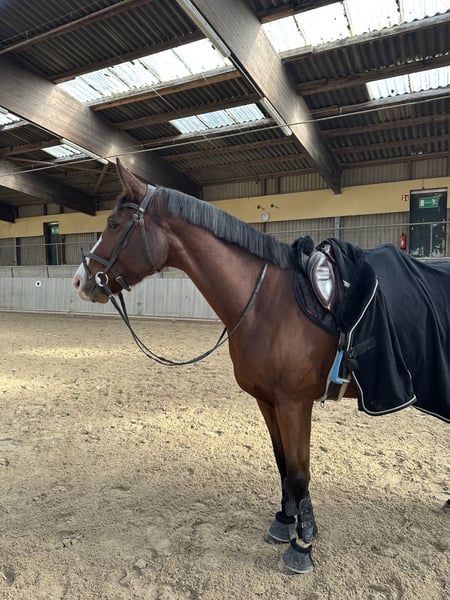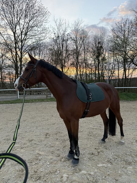 For sale is a striking 8-year-old mare with excellent pedigree (by Organo), whose exceptional quality over fences truly impresses. She impresses with her agility, strength, and a very good work ethic. At the jumps, she consistently displays motivation, attentiveness, and a desire to reach the other side. Her ambition and willingness to perform make her a reliable partner in sport. In everyday handling, she is absolutely uncomplicated: she loads easily and remains calm and well-behaved with the farrier and veterinarian. In the field, she is fearless and shows strong nerves. With her great potential, she offers ideal prerequisites for competition in higher jumping classes and is especially suitable for ambitious riders.