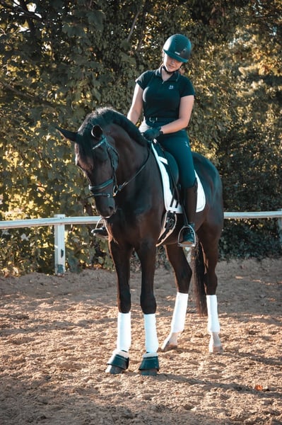 For sale is our approximately 16.1 hh, 8-year-old Hanoverian dark bay mare, "Scarlet Witch." Pedigree: Blue Hors St. Schufro x Rotspon 👉 Pedigree: https://www.horsetelex.de/horses/pedigree/2078013/scarlet-witch Her dam, Rotissima, is the dam of several licensed and successful Grand Prix stallions, including San Gennaro (2009 by San Remo) and Quaterbac (2010 by Quaterback). Scarlet has been in our possession since she was 4 years old and has placed in the Level A dressage tests. Unfortunately, she sustained an injury at age 5 and required surgery on both hind legs at Hochmoor Veterinary Clinic. At age 6, she was bred to VJENTO (Valdiviani x Sir Donnerhall I – Station Schult, Hünxe) and delivered a healthy black colt last year. ➡️ Currently, Scarlet is again in foal to VJENTO and is expecting her foal at the end of June 2026. Due to her previous injury, Scarlet is being sold solely as a broodmare, companion horse, or light leisure horse for occasional gentle work and relaxed rides. The sale is due solely to family reasons, as our daughter has returned to show jumping. Photos and videos (without rider) are from April 23, 2026. Serious inquiries are welcome, and we look forward to hearing from you.