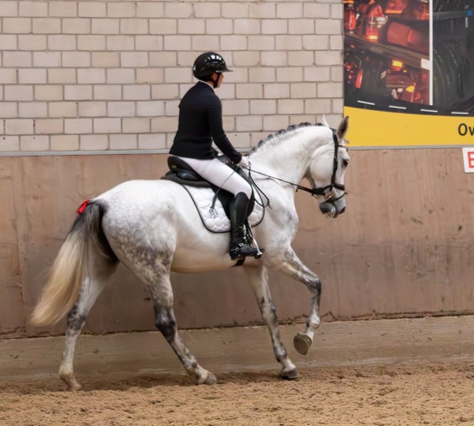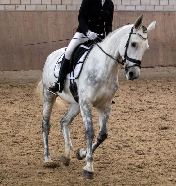 For sale is a 9-year-old dressage mare, renowned for her rideability and pleasant nature. She is very comfortable to sit, eager to work, and demonstrates lightness in the contact with a calm, steady gait. She has three good gaits and provides her rider with a good feeling and enjoyment in daily work. The mare has been professionally, horse-appropriate, and versatile trained (dressage, groundwork, double longe, cavaletti, trail riding). While her main focus is on dressage, she is also very suitable for ambitious leisure riders. In handling and training, she is sensitive and attentive. She is initially somewhat cautious with new experiences but can be easily guided with a calm and confident rider’s hand. When in the field, she behaves well in a group; alone, she is a bit more sensitive but always manageable. She prefers an experienced, calm handler with clear, structured aids and consistent, reliable handling. She feels most comfortable with clear instructions and a secure rider’s hand. Therefore, she is not suitable for complete beginners but better suited for riders with some experience. Competition Experience: First outings in summer 2025 up to A-level, including a team performance with a score of 8.0, as well as a start in L-dressage on a snaffle bridle (6.0). Her rideability and good basic gaits make her not only sportily attractive but also interesting from a breeding perspective. Key Data: • Born April 2017, approximately 16.1 hh • Full-day turnout in paddock during winter and summer, stabled at night • Low-ranking and compatible with other horses • Teeth regularly maintained • Regular physiotherapy and osteopathy treatments • Four-hoof shoes Current Status: From mid-March 2026, we will begin her retraining after a pasture injury to the hock ligament, which is being medically monitored. She remains on full-day turnout, goes for walks, and walks in the indoor arena at a walk, which she handles well. An existing disability insurance with R&V, Tarif Excellent, can be transferred. Health: • AKU at purchase at age 4: incidental finding of hock cartilage ossification, which has not caused any impairment so far • Wolf tooth removal with incidental finding (cyst in the jaw joint, which has not caused any restrictions) Documents and X-rays can be sent upon serious interest and after prior telephone contact. Videos: The posted videos show Felipa with me and my trainers. Summary: An honest, finely rideable mare for experienced amateur and leisure riders who enjoy harmonious riding and want to give a sensitive mare the time she needs.