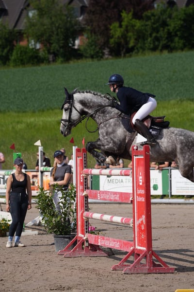 A stunning Hanoverian mare born in 2017 is for sale. She impresses every day with her great willingness to perform and her lovable character. Her calm and affectionate nature makes her very easy to handle. She rides calmly in the field and is always well-behaved when traveling in the truck or at the blacksmith. In the show jumping arena, she displays a lot of ambition and power, so she is not suitable as a beginner’s or children's horse. She is a 7-year-old, having achieved M** placings and competed successfully at S level. Unfortunately, I haven't been able to ride her much this year due to lack of time, so at 8 years old, she has only competed very sparingly. With a heavy heart, I am offering her for sale because I can no longer dedicate enough time to her due to my professional commitments. X-ray images from March 2023 and August 2024 are available. Please feel free to contact me if interested. Viewings and trial rides are possible by appointment (Location: Göttingen). Phone: 0172/2963401