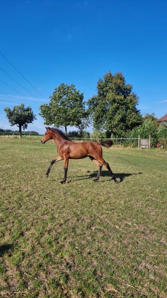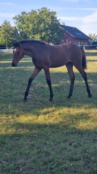 Hallo, wir bieten ein sehr korrektes, langbeiniges und kopfklares Stutfohlen aus April 2025 an. Sie besticht mit ihrem sehr harmonischen Bewegungsabläufen. Dressurgezogen. Sie kennt Hunde, Katzen, Kinder & Maschinen. Das Fohlen ist gesund, regelmäßig geimpft und entwurmt. Bei weiteren Fragen / Video- Bildmaterial melden Sie sich gern ! Bild 6: Vater Vidar Bild 7: Muttervater Fürst Belissaro Telefonisch erreichbar unter 0170/1655297