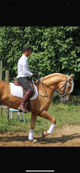 Zum Verkauf steht ein beeindruckendes Hispano-Arabisches Pferd mit goldener Palomino-Farbe. Derzeit ist es 4,5 Jahre alt, misst 1,65 m und besitzt eine elegante, tragfähige Erscheinung. Es ist noch jung und verfügt über ein vielversprechendes Entwicklungspotenzial. Charakter und Fähigkeiten: Es ist ein unkomplizierter, ausgeglichener und sehr angenehmer Begleiter im Alltag. Besonders menschenbezogen zeigt es stets Respekt und ist beim Training immer motiviert. • Niveau: Grundkenntnisse in den drei Grundgangarten. • Exterieur: Sehr zuverlässig, geht problemlos alleine ins Gelände. • Vielseitigkeit: Perfekt für Freizeit, Amateurdressur oder für einen Reiter, der einen gesunden, ausgeglichenen Partner sucht. Lebensweise und Gesundheit: • Haltung: Gewöhnt an die Weide mit Artgenossen (sozial), kennt auch den Offenstall. • Transport: Problemloses Reisen. • Gesundheit: Aktuelle Impfungen, gesundes Pferd. Besonderheiten: Sein vorbildliches Wesen, seine Vielseitigkeit und die außergewöhnliche Farbe.